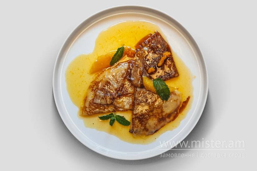 Тонкі млинці, просочені насиченим апельсиновим соусом із додаванням лікеру.
