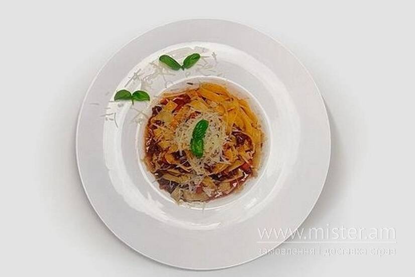 Паста власного виробництва з м`ясним рагу на основі томатного соусу з овочами.
