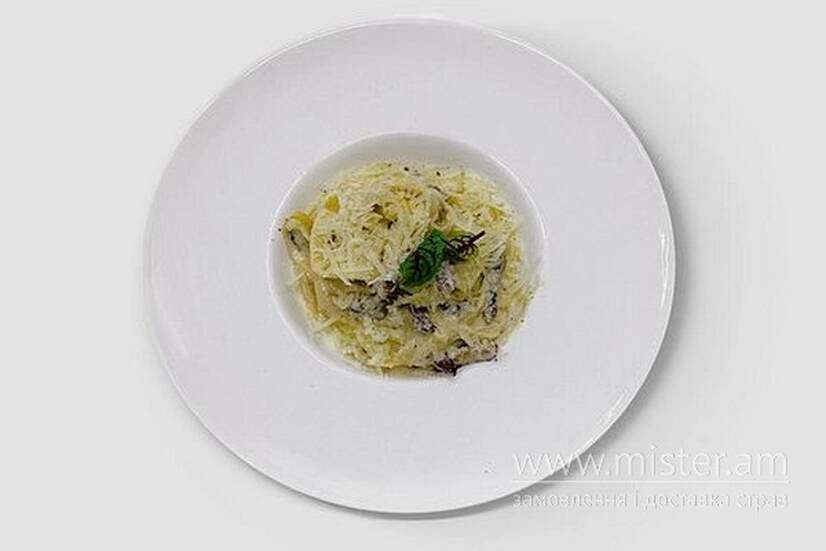 Готуємо на вершковій основі з жовтком. Щедро додаємо бекон та пармезан.