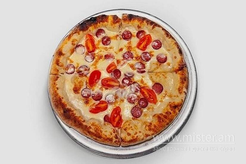 Ковбаска єгерська, моцарела, чері, пармезан соус Бешамель.