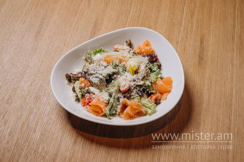 Мікс салатів, свіжі чері, лосось власного соління, перепелині яйця, сухарі, смажені каперси та пармезан. Заправляємо соусом Цезар.