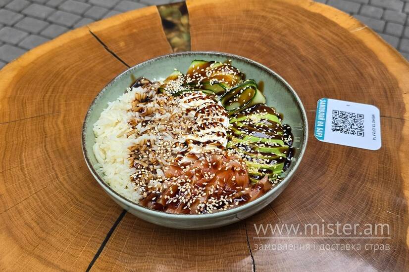 Рис басматі з вершковим маслом, свіжий огірочок, авокадо, червона рибка власного засолу, крем сир, теріякі та смажений кунжут.
