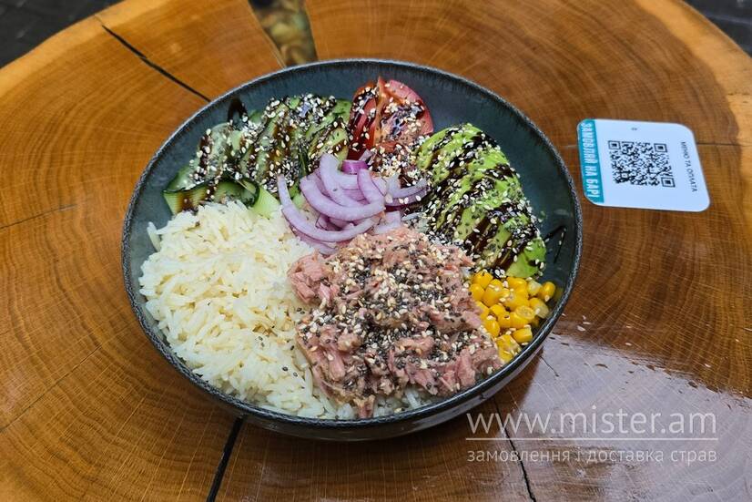 Рис басматі з вершковим маслом, огірочки, томати, авокадо, кукурудза маринована солодка, тунець, фіолетова цибулька, чіа, бальзамічний соус.