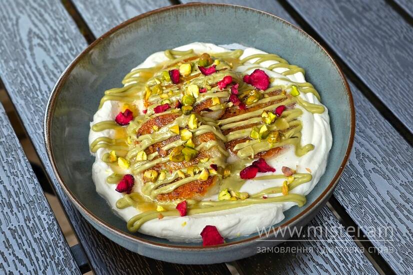 Ніжні рослині вершки, пухкі сирники, справжня паста фісташки, сублімована вишня та хрумка фісташка.