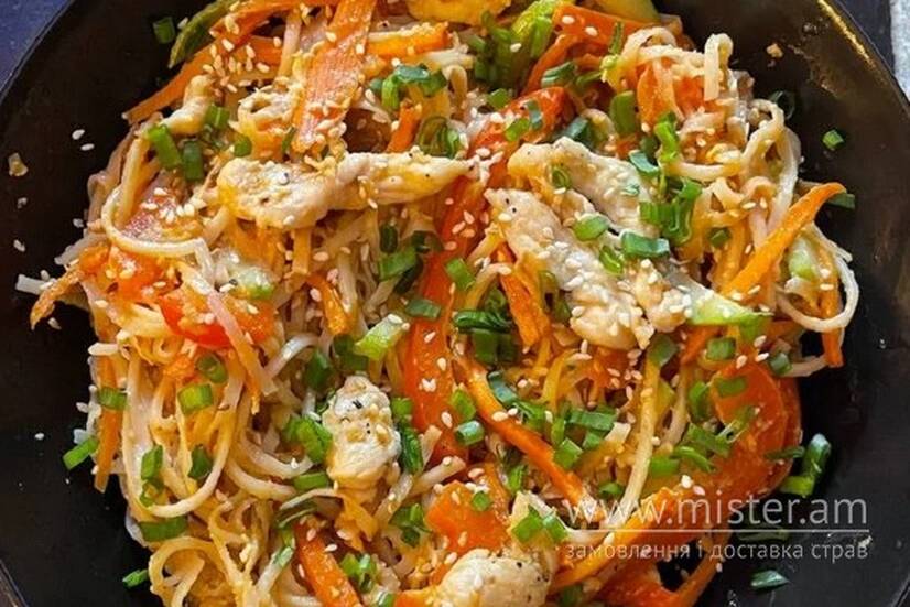 Локшина яєчна, кабачок, перець болгарський, часник, морква, соєвий соус, кунжут, яйце, зелена цибуля. Та додатки на вибір.