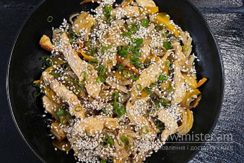 Локшина удон, перець болгарський, морква, часник, цибуля синя, імбирний корінь, соус солодкий чілі, гриби шампіньйони, цибуля зелена, кунжут, соус теріякі, соєвий соус, морепродукти або курка на вибір.