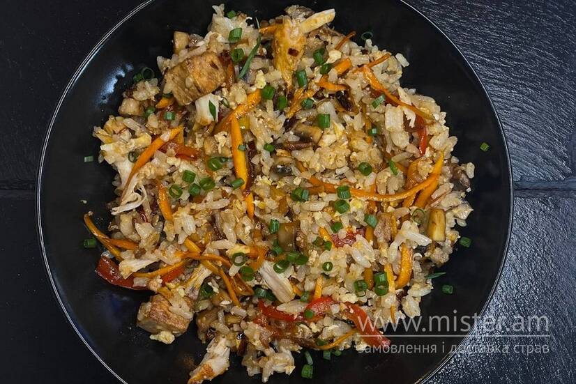 Рис, морква, шампіньйони, цибуля марс, часник, імбир, соєвий соус, яйце, перець болгарський, зелена цибуля, курка або морепродукти на вибір.