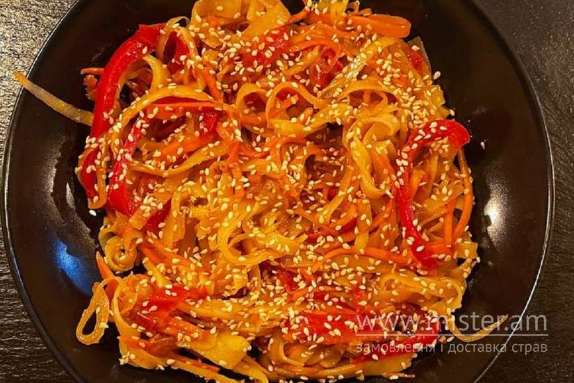 Локшина рисова, перець болгарський, капуста сезонна, помідор чері, морква, цибуля марс, крафтовий соєвий соус, лайм, кунжут, та наповнення на вибір.