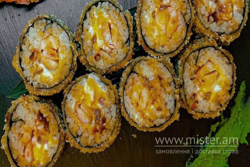 Рис, норі, сир Філадельфія, креветка тигрова, вугор, тісто темпура, сухарі панірувальні, соус теріякі.