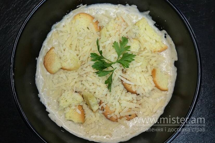Гриби шампіньйони, вершки, цибуля марс, пармезан, сухарики.
