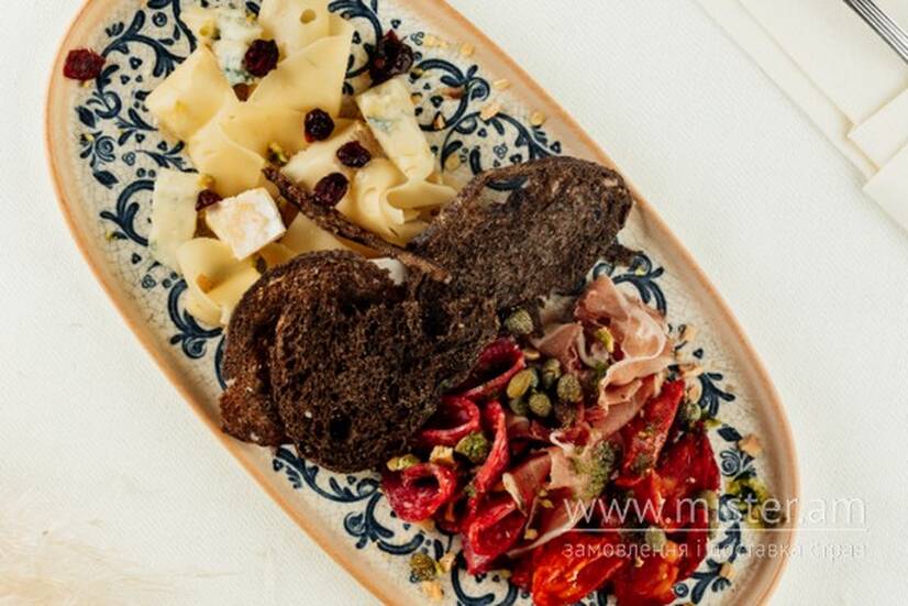 Сир: Брі, Дор блю, Ементаль, ковбаса Чоррізо, салямі, хамон, соус Песто, каперси, мед, мигдалеві пластівці, цукати, сушена журавлина, оливки.