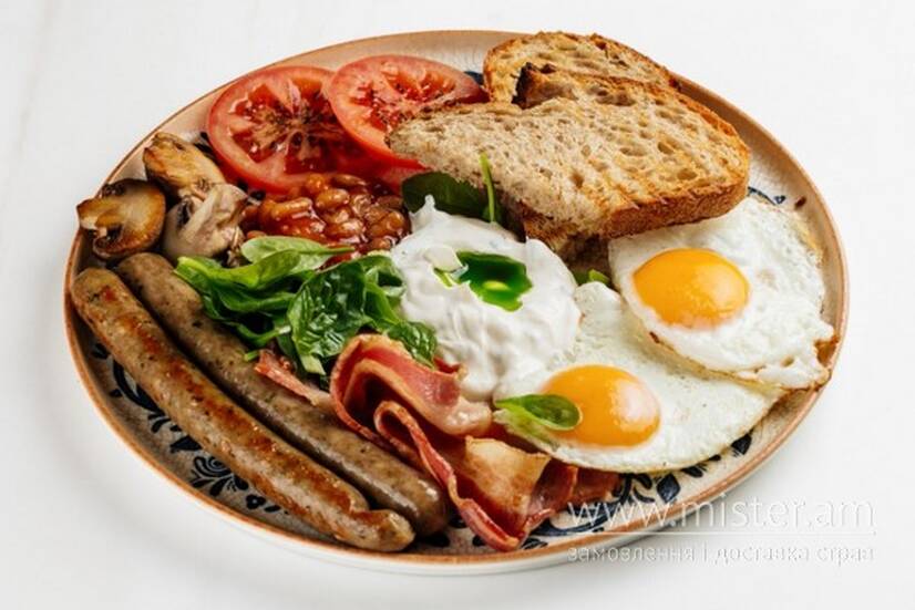 Яйця глазуньї, смажені ковбаски, гриби та квасоля у томатному соусі. Доповнюємо слайсами хрусткого венгерського бекону, йогуртом та грінками.