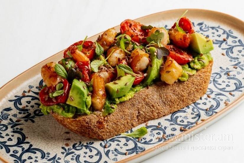Грінка з хлібу на заквасці (випеченого в нашій пекарні), крем-сир і гуакамоле а далі щось чудесне - мікс креветок і соковитих чері, запечених з травами.