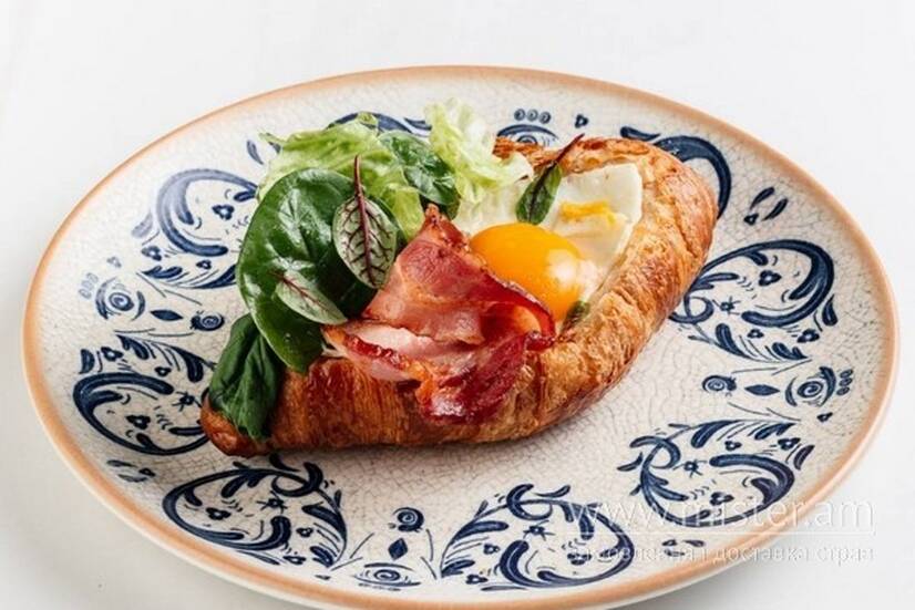 Круасан, яйце куряче, моцарела, бекон, мікс салату, пармезан.