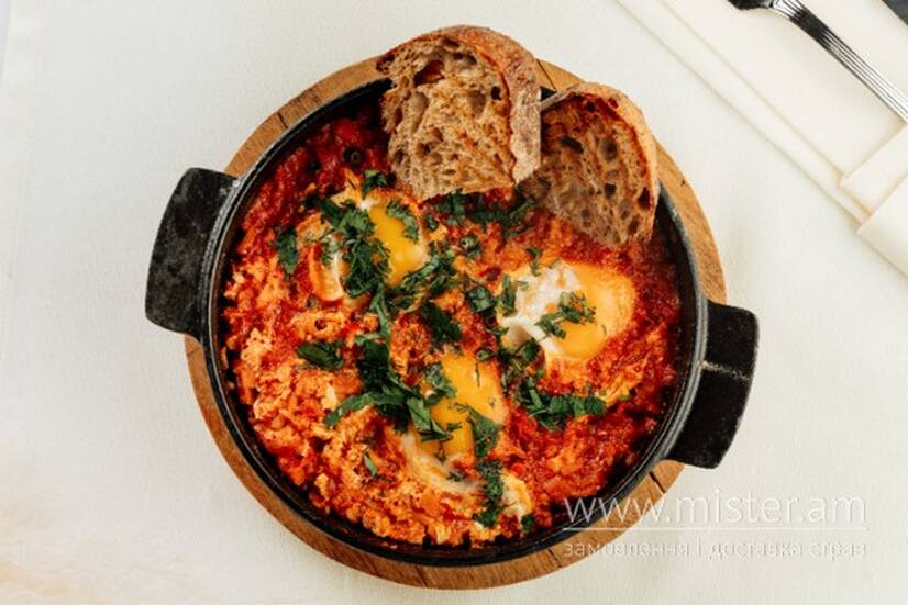 На сковорідці - соус матбуха на основі соковитих томатів та перцю, яєчня з трьох яєць, обов`язково спеції і грінки французького багета на заквасці.