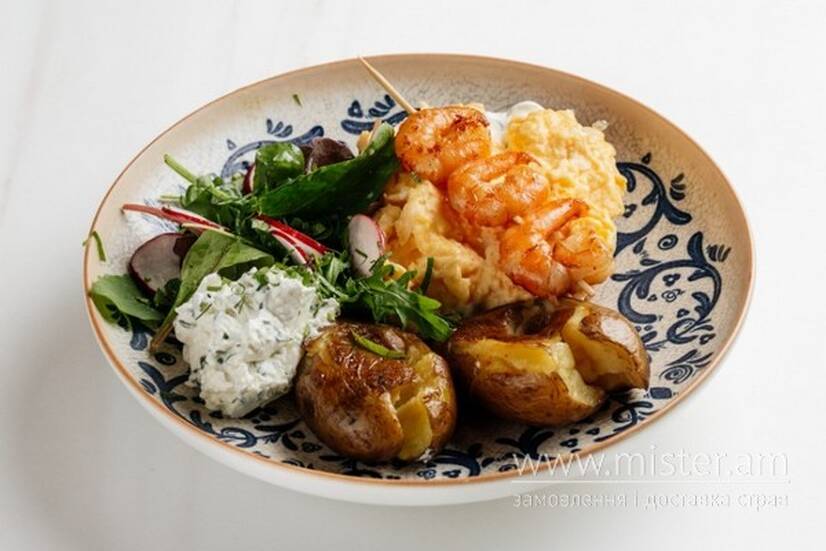 Вершковий скрембл на грінці з Бріош, обсмажені креветки, дві печені картоплини з сиром та зеленню, соус Лабне, мікс салату з редискою та насінням льону.