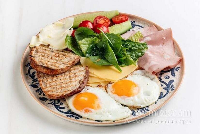 Яйце куряче, мортадела, твердий сир, грінки з цільнозернового хлібу, вершкове масло, мікс салату, томати Чері.