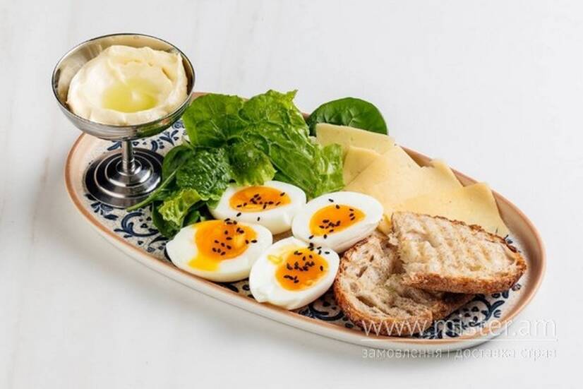 Яйце куряче, сир твердий, вершкове масло, мікс салату, грінки з цільнозернового хлібу, пряна олія.
