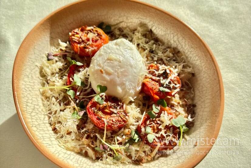 Морелі Солона вівсянка з в`яленими томатами, яйцем пашот та пармезаном