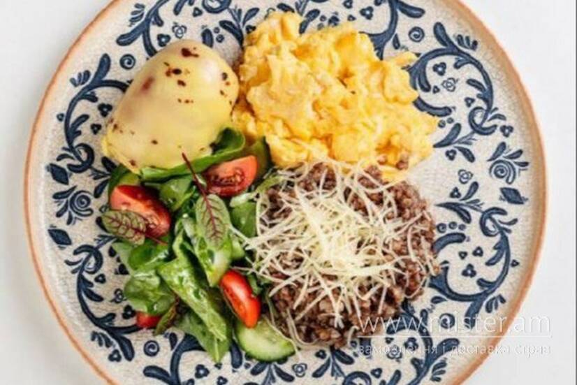 Гречка з пармезаном, підкопчена сарделька, сир Чеддер, мікс салату, томати чері, яйце куряче, вершки.