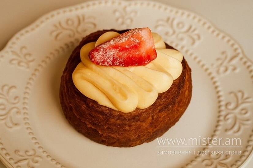 Легке та ніжне заварне тісто зі свіжим кремом манго, доповнене соковитим полуничним компоте. Тропічна насолода з ніжним ягідним акцентом — справжнє свято смаку.