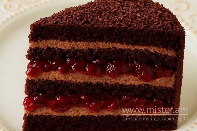Шоколадний бісквіт, просочений вишневим соком, з заварним шоколадним кремом, кислинкою вишні та ніжним шоколадом, що створює гармонію смаків та текстур.
