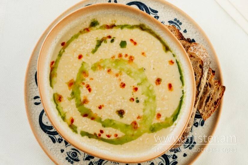 Крем-суп з тигровими креветками, мідіямі, кукурудзою та беконом.