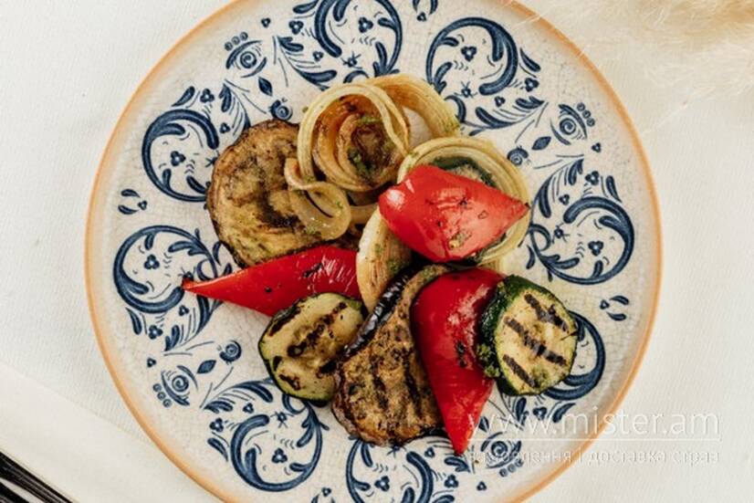 Цукіні, баклажан, перець, цибуля - це овочі обсмажені на грилі з соусом песто.