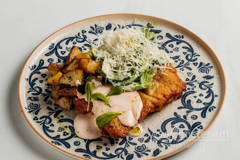 Ніжний шніцель із соковитого індичого стегна з хрусткою скоринкою, подається з молодою картоплею у вершковому соусі зі свіжим шпинатом. Домашній смак із сучасним акцентом.