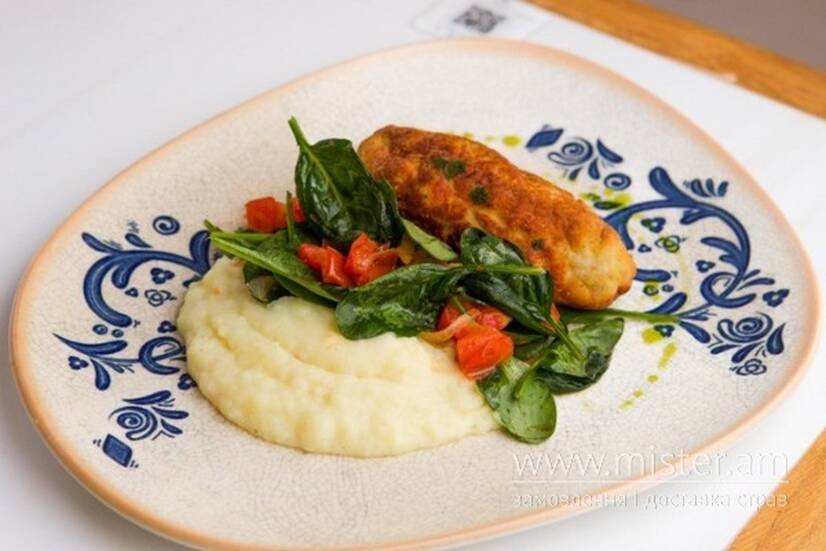 Страва подається з оксамитовим картопляним пюре, бланшованими томатами з карамелізованою цибулею шалот та свіжим листям шпинату, що надає легкості та гармонії смаку.