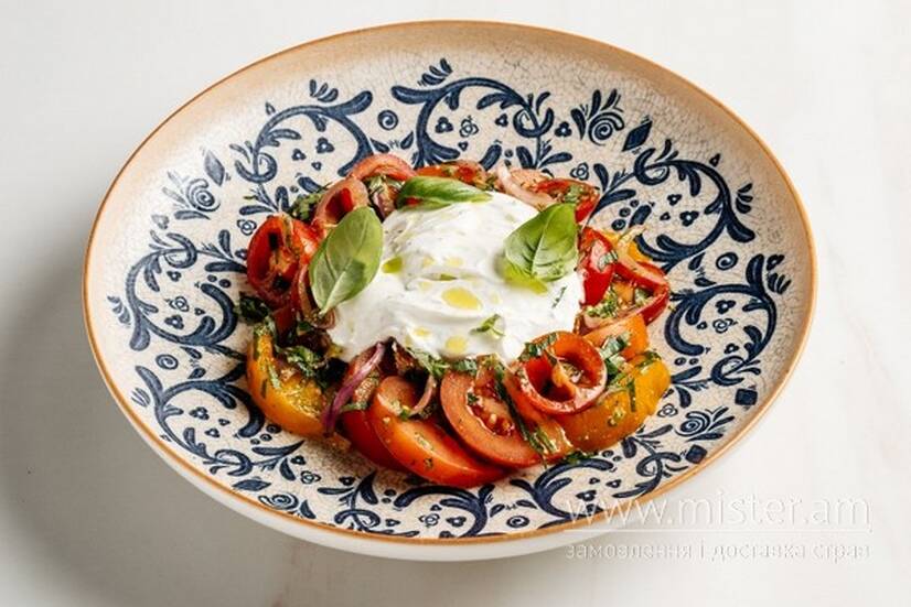 Легкий і ароматний салат з поєднанням стиглих помідорів та запашного базиліку. Подається з ніжним соусом Лабне, яскравим соусом песто та хрусткими шматочками хліба. Соковитий, свіжий і гармонійний у кожній ноті — ідеальний вибір для літнього настрою.