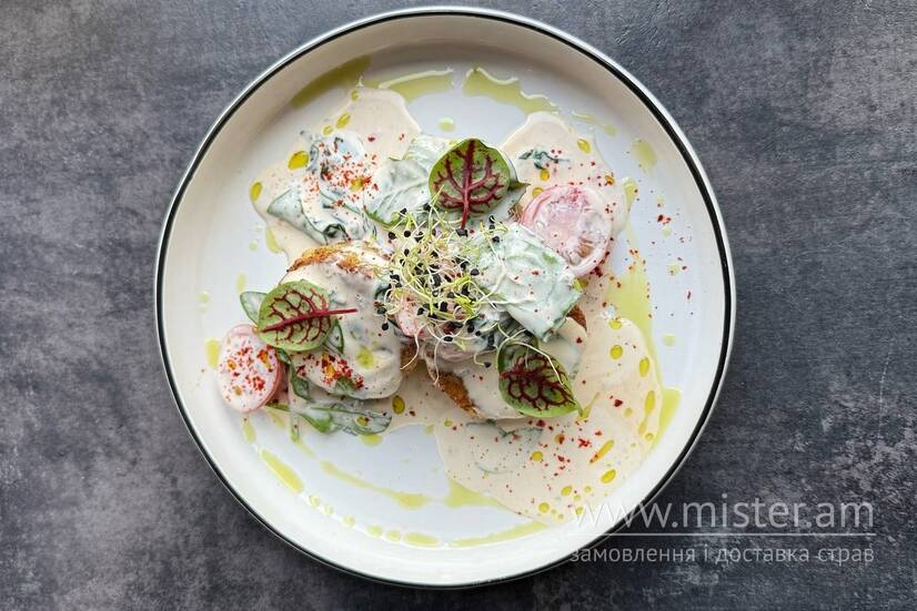 Солоні сирники зі шпинатом та кропом. Подаються з вершковим соусом блю чіз, томатами чері та шпинатом.