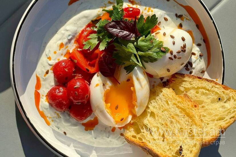 2 відварених яйця з рідким жовтком, печений болгарський перець та помідори чері, соус дзадзикі, мікс зелені, хліб тартін, насіння льону та олія з копченої паприки.