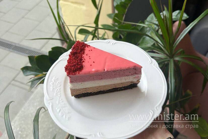 Бісквіт з чорного шоколаду, мус з молочного, білого та малинового шоколаду