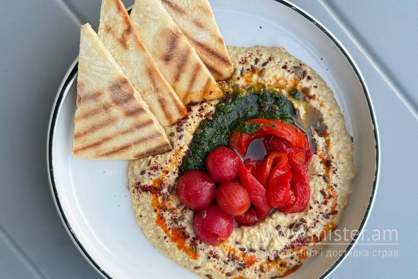 Хумус з нуту зі східними спеціями. Подаємо з пітою, печеним болгарським перцем, печеними помідорами чері, соусом песто, олією з копченої паприки та насінням льону.