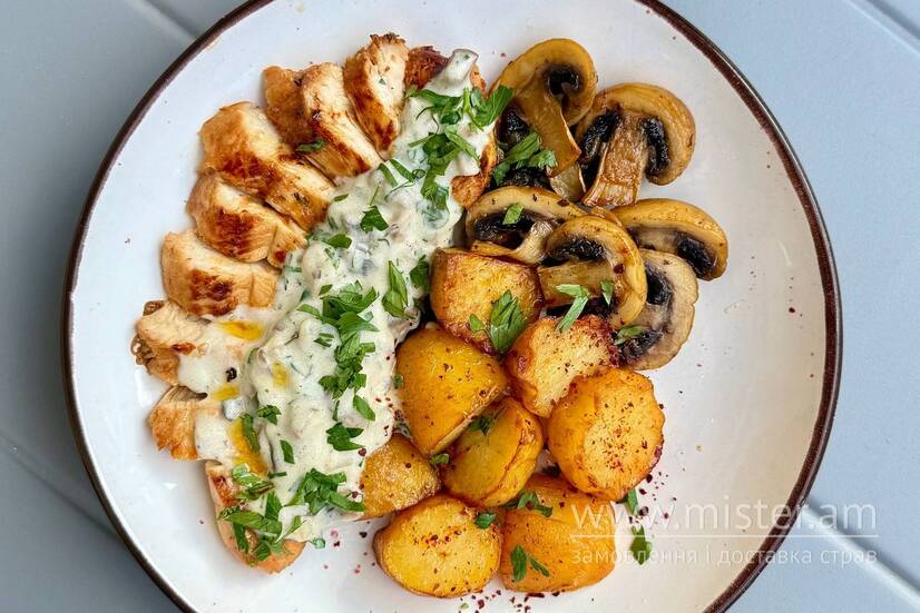 Стейк з курячої грудки, подаємо зі смаженими грибами, смаженою картоплею та грибним соусом.