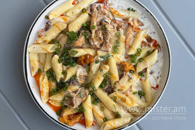 Паста пенне, лисички, верковий соус, бекон, пармезан, пудра з білого гриба, та зелена цибуля.