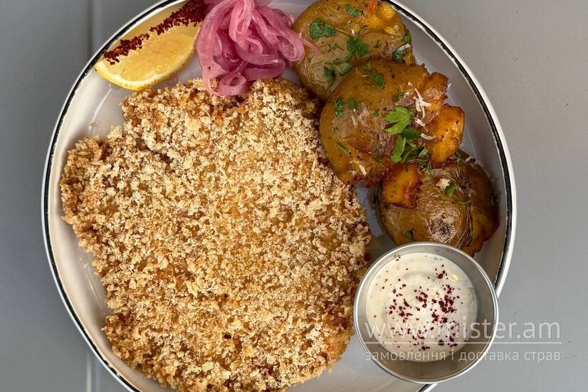 Свинний шніцель в сухарях панко, подаємо з мʼятою картоплею з трюфельним маслом та зеленню, солодкою маринованою цибулею, трюфельним айолі та лимоном.