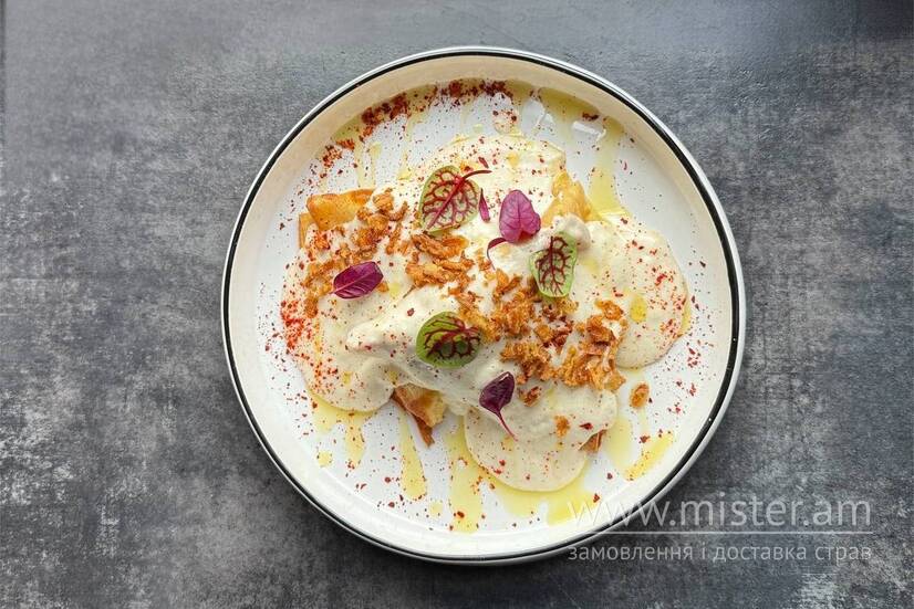 Млинець, фарш свинний, грибний бешамель, цибуля кріспі, зелень, трюфельна олія, перець гочугару.