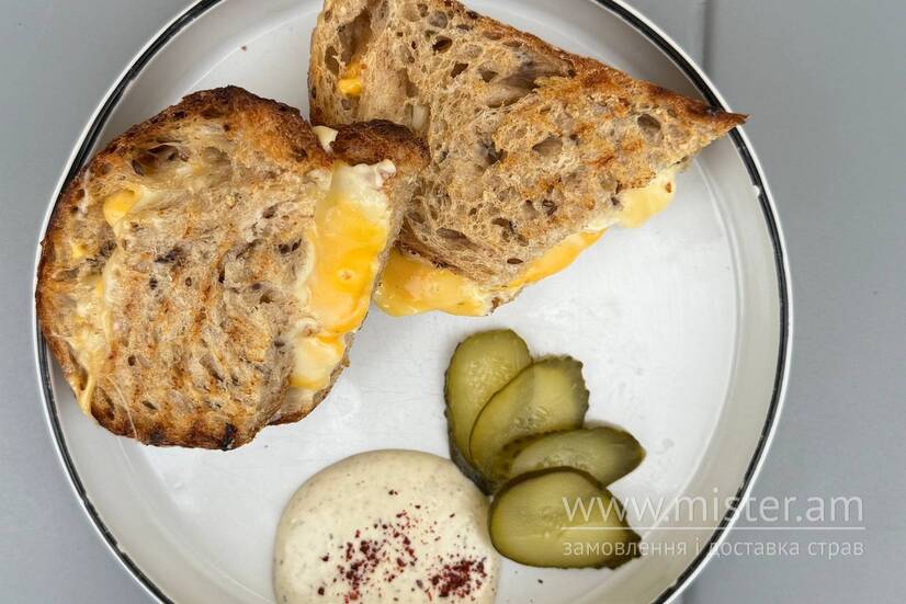 Сирний сендвіч з хліба тартін з сиром чеддер, моцарелою, сирним соусом та сиром брі. Подаємо з маринованим огірком та трюфельним айолі.