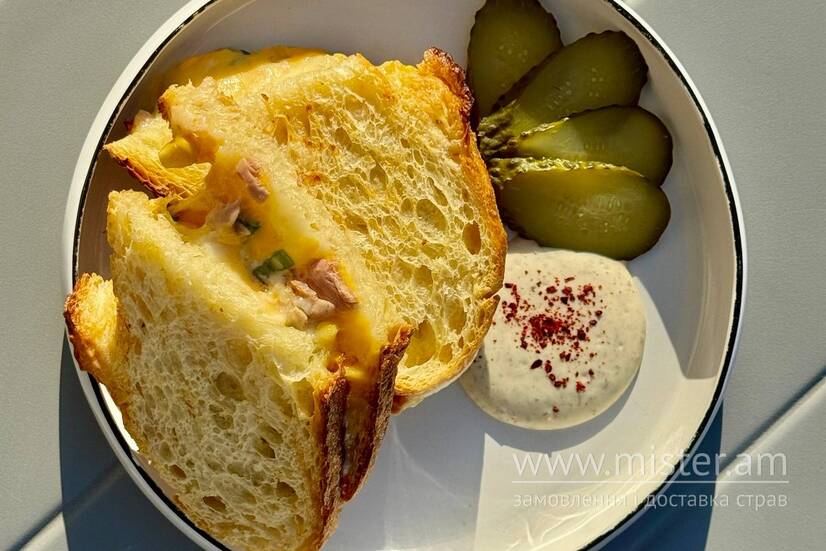 Сирний сендвіч з хліба тартін сиром чеддер, моцарелою, консервованим тунцем, кукурудзою, та зеленою цибулею. Подаємо з соусом трюфельний айолі, та маринованим огірком.