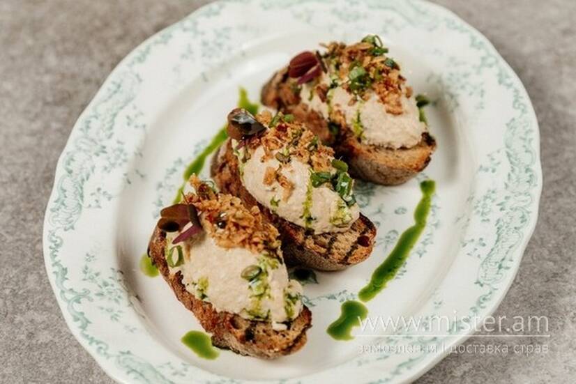 Грінка з гречаного багету, намазка з консервованого тунця, вареного яйця та домашнього майонезу, зелена цибуля, цибулевий кранч.