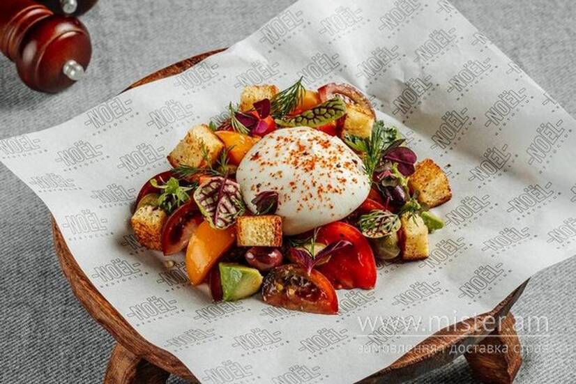3 види томатів, каперси, каламата, авокадо, заправляється лимонним соусом. Зверху ціла буррата, посипається тагараші, базилік, подається з хрустким бріошем.
