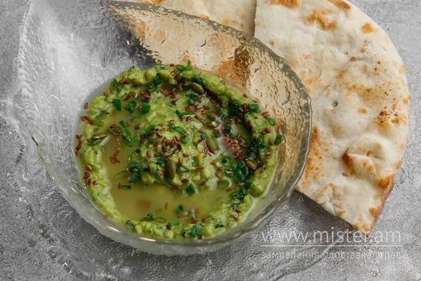 Авокадо, кінза, кунжутне масло, хондаши дресінг, оливкова олія, чилі олія, сік лайму, насіння льону та гарбуза, зелена цибуля. Подається з паляничкою.