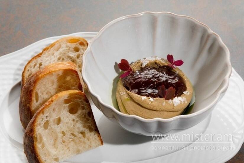 Куряча печінка вимочена в молоці, обсмажена з чебрецем, часником, цибулею, морквою, сало, коньяк, кориця, джем інжирний, зелена олія, пластівці солі, мікрогрін. Подається з трьома грінками.