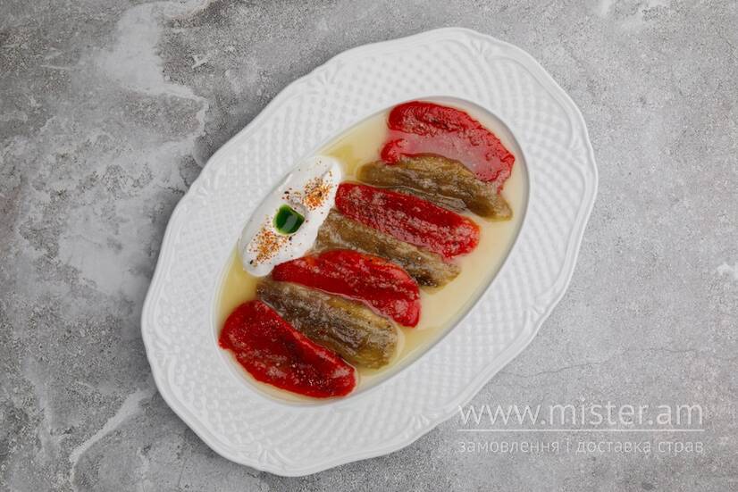 Печені перці, баклажани, грецький йогурт, часникова олія, тагараши, хондаши дресінг.