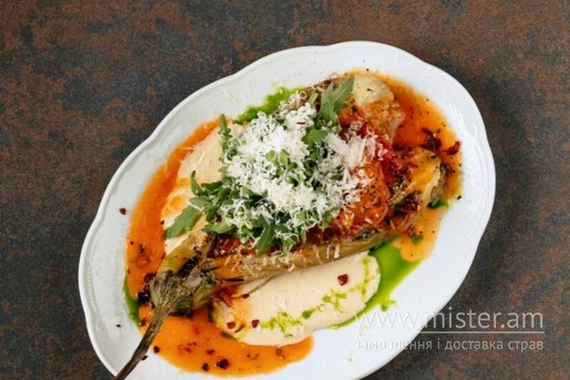 Запечений баклажан, соус Цезар, томатна сальса, часникова олія, руккола, пармезан. Подається з паляницею.