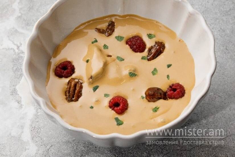 Шоколадний бісквіт, крем на основі вареного згущеного молока, сиру філадельфія, сметани. Посипається сезонними ягодами та горіхами пекан і кеш`ю, м`ятою.