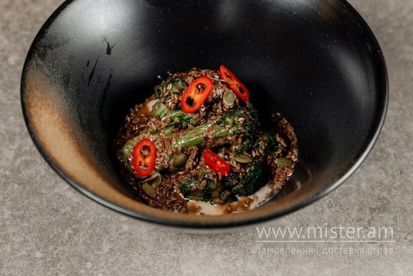Броколі печуться у хоспері, перець чилі, насіння льону та гарбуза. Подаються на горіховому соусі.