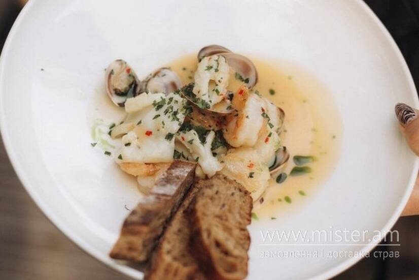 Креветки, гребінці, вонголе, кальмари. Соус на основі вершкового масла, вина, чебрець, часник, чилі, петрушка, лимонний сік, рибний бульйон. Подається з двома часниковими грінками з гречаного багету.